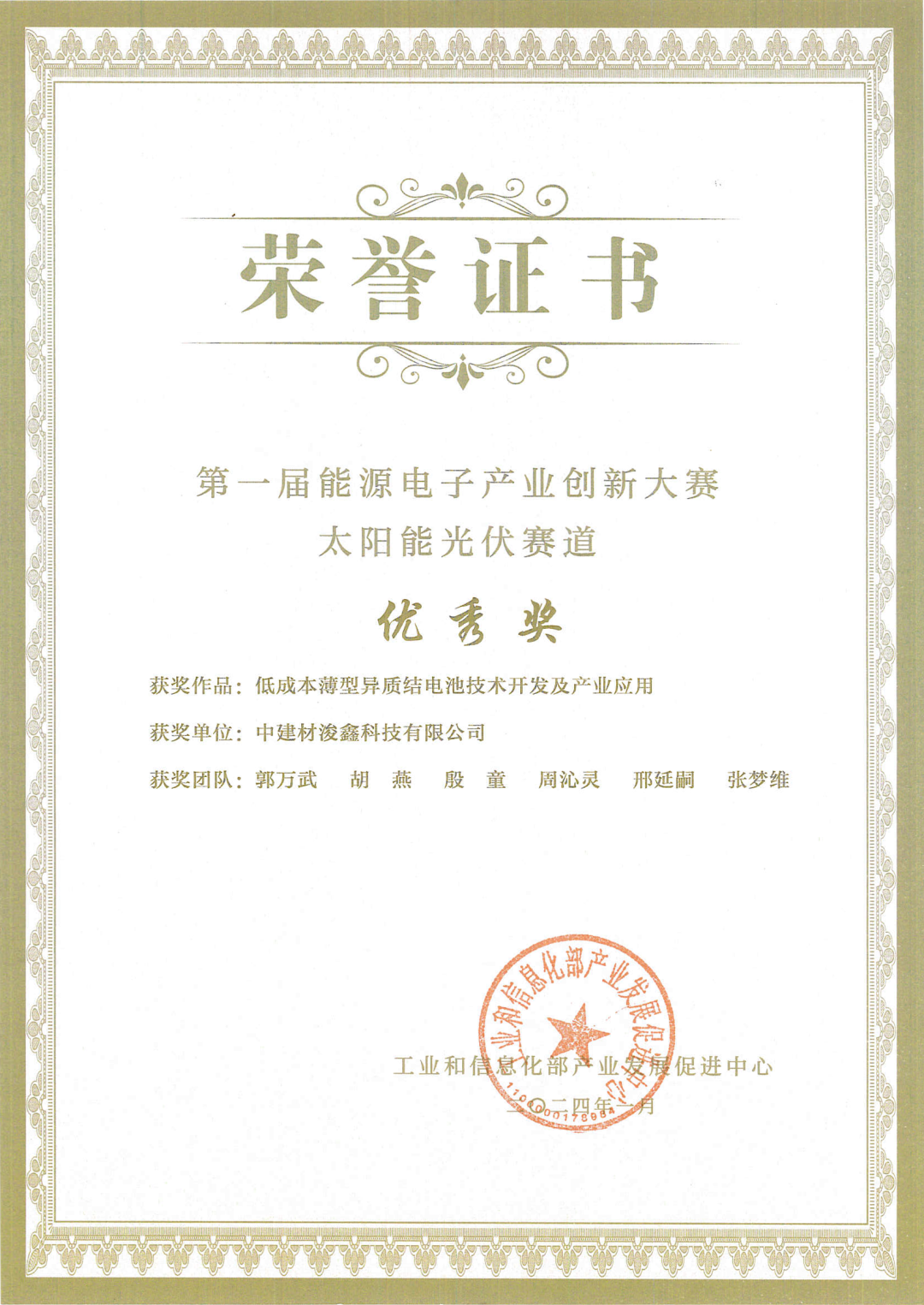 喜报!中建材浚鑫荣获第一届能源电子产业创新大赛太阳能光伏赛道优秀奖