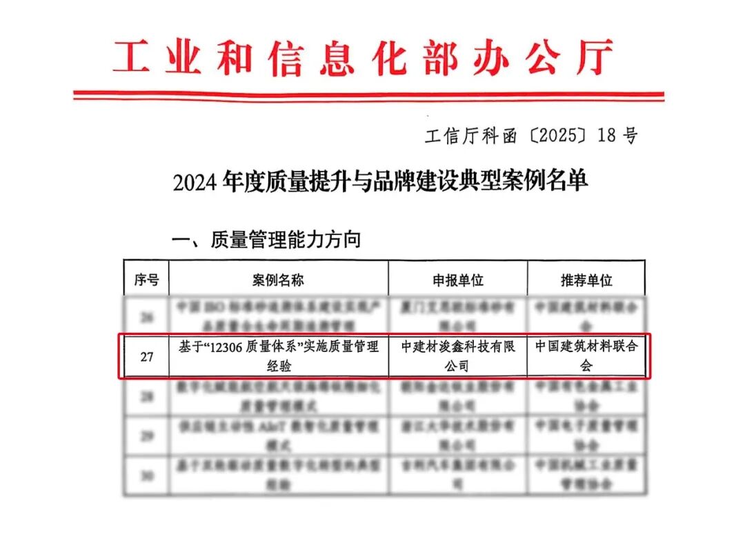 中建材浚鑫基于“12306质量体系”所实施的质量管理经验,成功入选工信部2024年度质量提升与品牌建设典型案例。该评选经过多轮严格审查与公示,全国仅100项案例入选,旨在推广先进质量管理模式,助力打造具有国际影响力的“中国制造”品牌。