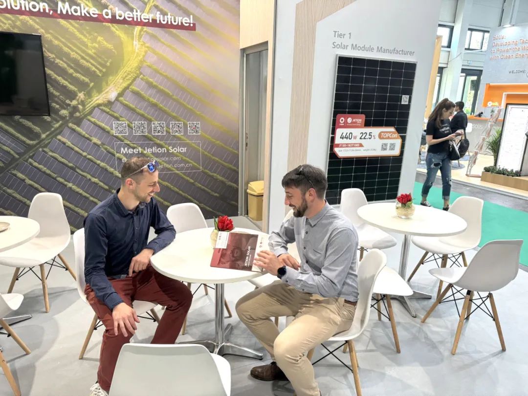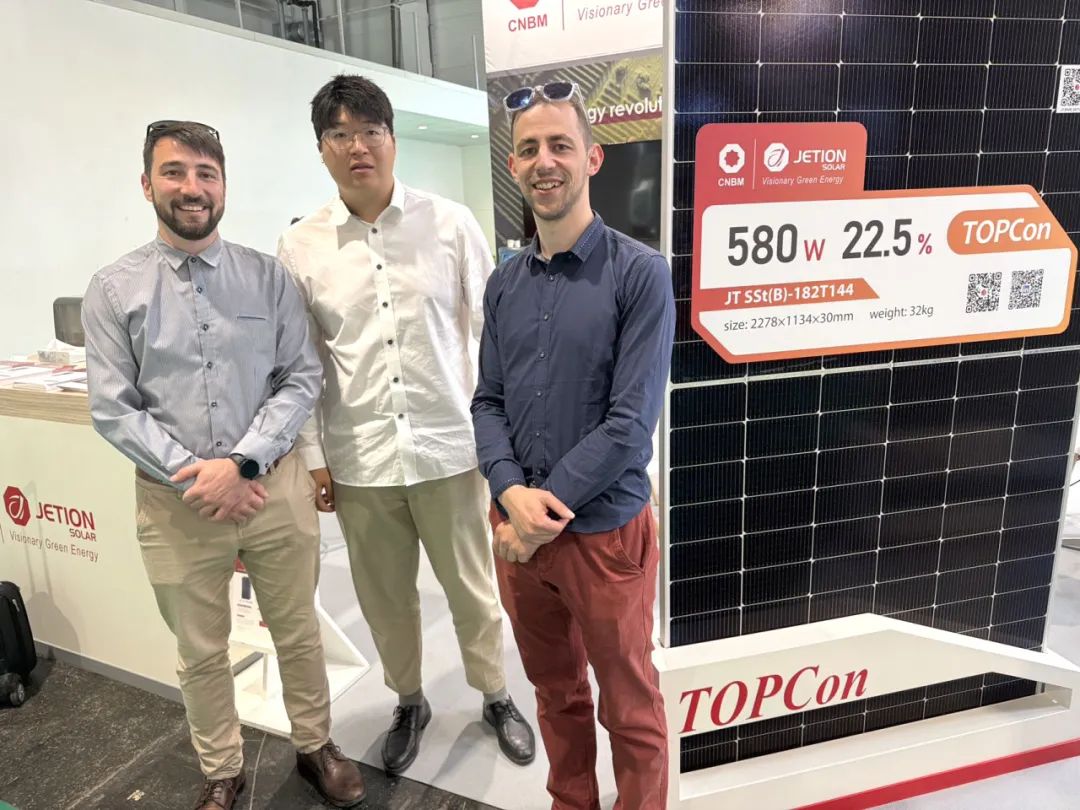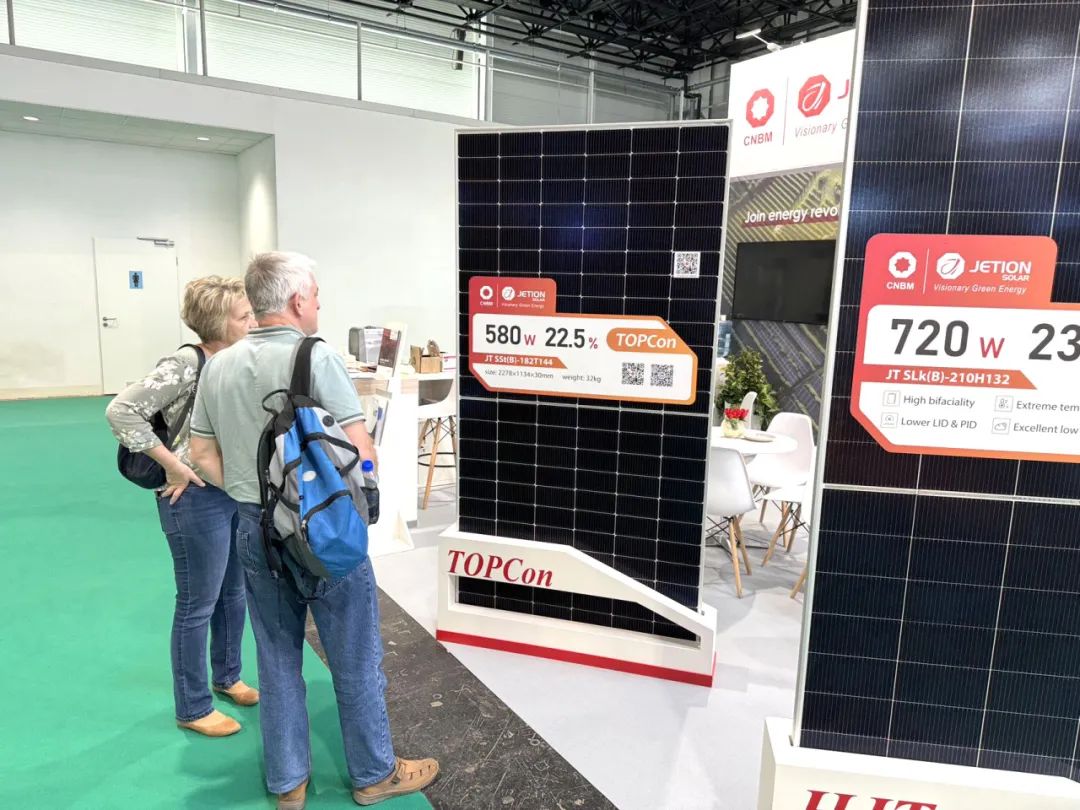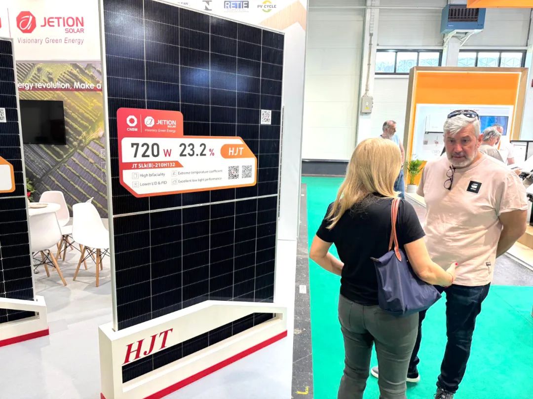 与此同时,中建材浚鑫的展位也吸引了众多寻求绿色能源解决方案的新面孔。公司专业团队详尽介绍了本次带来的N型新技术产品,其中焦点为自主研发的Jeniüs N-HJT超高功率组件。这款组件应用了先进的异质结技术(HJT),其最高功率可达到720W。经实测数据显示,相较于传统的PERC组件,HJT组件的发电量提升了6%,相较于TOPCon组件则高出2%以上。除上述发电效率提升外,该组件还具备诸多核心优势:优越的弱光响应能力、更佳的温度系数、更高的双面率以及更低的初始与长期衰减率。这些新产品不仅精准契合了匈牙利本土市场对于高效、可靠的清洁能源之迫切需求,同时也为中东欧其他国家乃至整个欧洲市场提供了极具竞争力的解决方案选项。