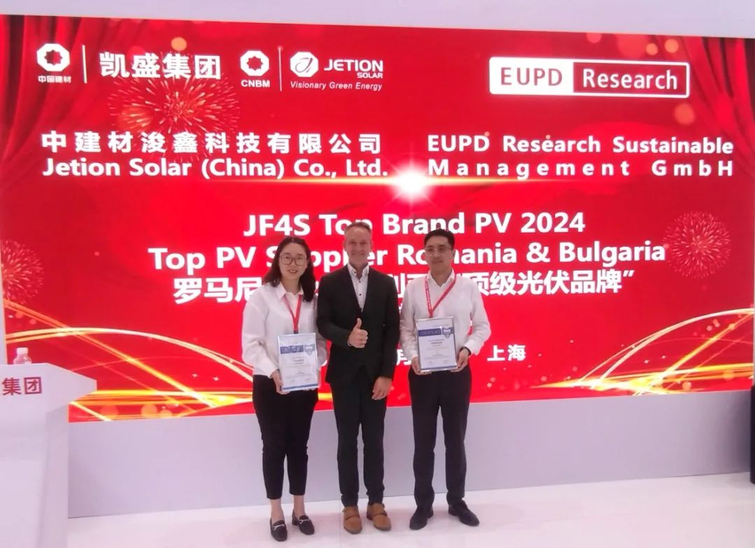 在此背景下,中建材浚鑫科技有限公司(以下简称“中建材浚鑫”)凭借卓越的产品质量和行业影响力,荣获了由欧洲权威调研机构EUPD Research颁发的罗马尼亚和保加利亚地区“顶级光伏品牌”大奖,再度彰显了公司在国际光伏市场的领先地位。