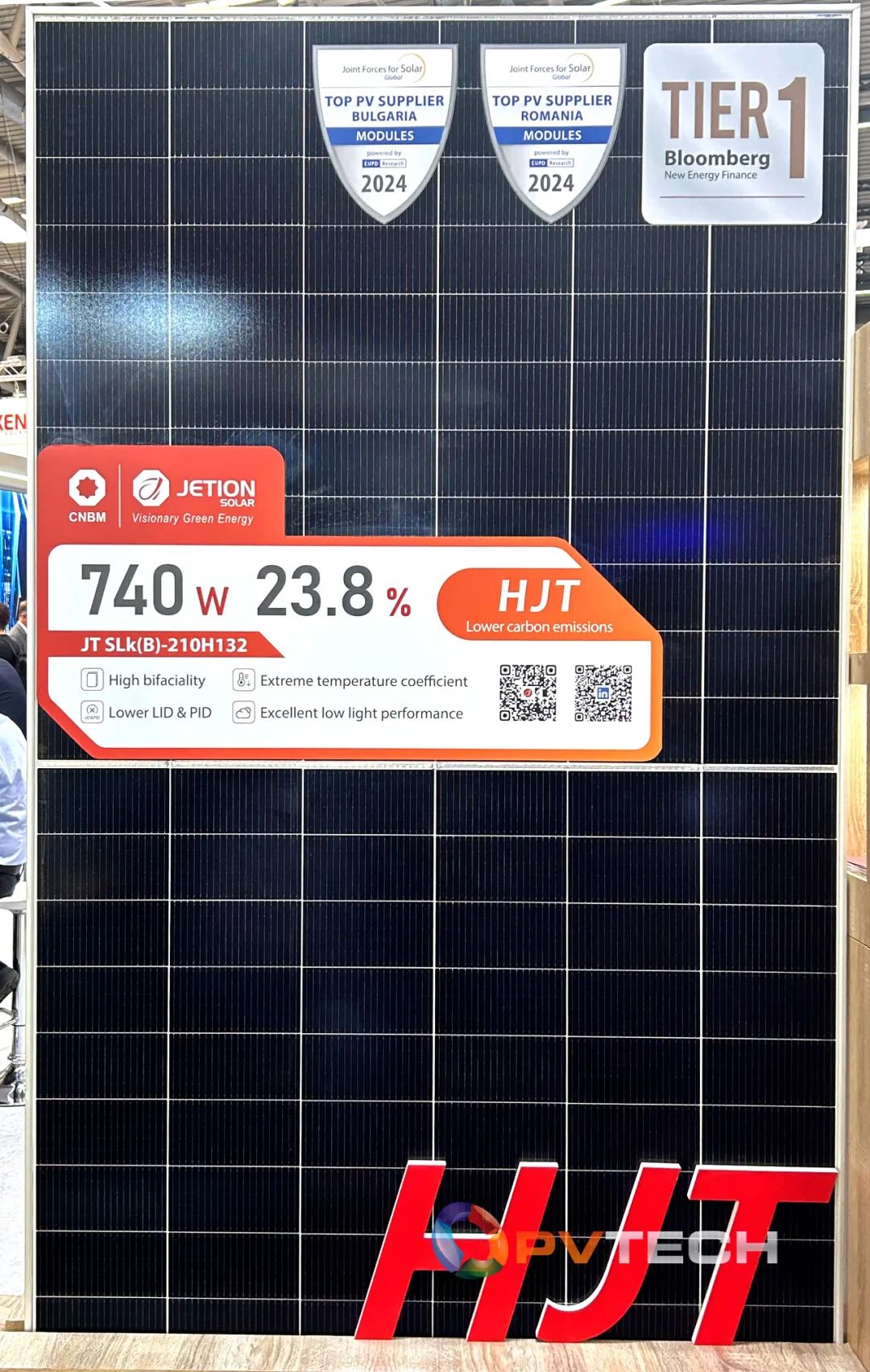 中建材浚鑫作为中国光伏行业的探索者,凭借着优异的产品质量和高度的客户评价在欧洲享有较高的知名度。此次展会,考虑到欧洲市场的特殊需求,我们共带来了6款异质结产品,功率区间从425W-740W全档位覆盖,转换效率最高可达23.8%,应用场景广泛,不仅适用于地面和海上等大型光伏电站,还可用于户用屋顶和车棚等分布式应用场景,满足客户多元化的需求,充分说明了浚鑫以客户价值为中心的态度。
