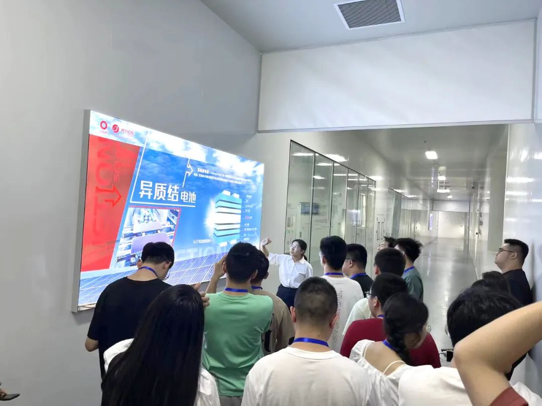 座谈会结束后,师生一行人被引导至参观通道,深入异质结太阳能电池的生产线,由专业技术人员详细讲解了异质结电池的先进制造工艺、自动化生产线的运作流程,以及精密的测试实验设备。这条生产线的自动化程度和精细操作给同学们留下了深刻印象,使他们对异质结技术的实际应用和生产过程有了更加直观的认识。整个参观交流活动不仅丰富了学生的专业知识,也激发了他们对光伏行业和异质结技术的浓厚兴趣。