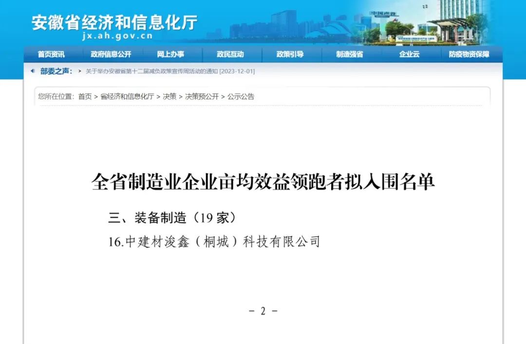 安徽省经信厅公示了全省制造业企业“亩均效益领跑者”评选结果,中建材浚鑫(桐城)成功入选。