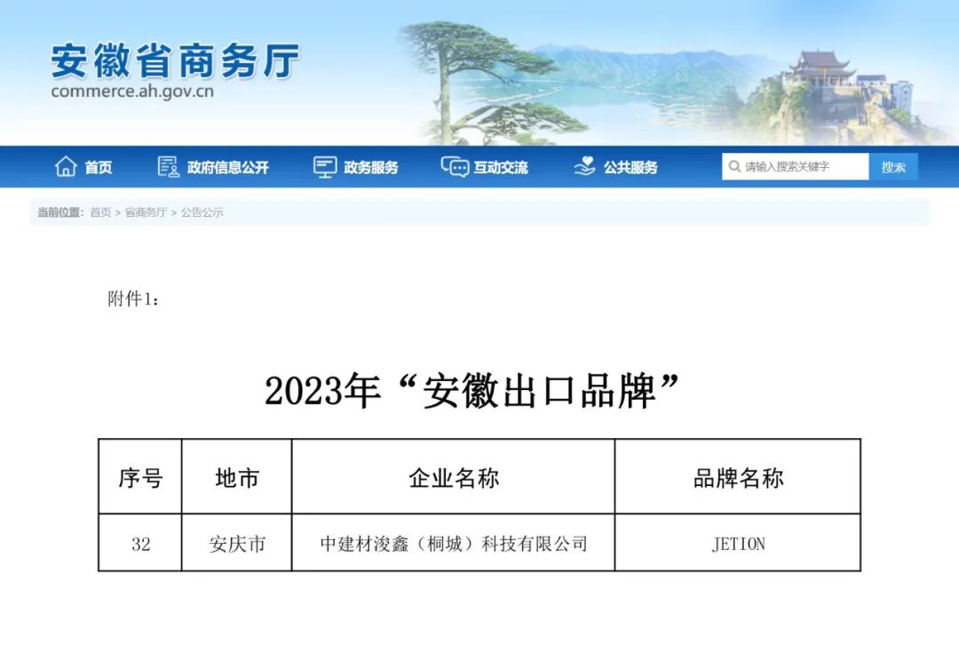 安徽省商务厅公布了2023年“安徽出口品牌”认定名单, 其中中建材浚鑫(桐城)科技有限公司以“JETION”品牌成功上榜。