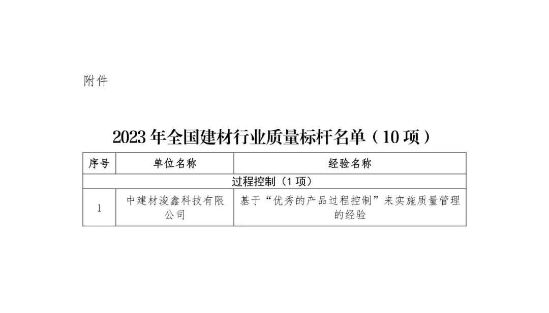 日前,中国建筑材料联合会发布2023年全国建材行业质量标杆典型经验遴选与交流活动获奖名单,中建材浚鑫斩获头筹,取得全国建材行业标杆企业荣誉。